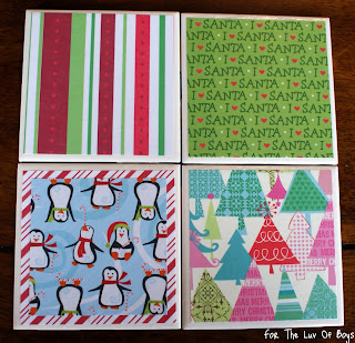 I did very basic designs for the example on here, but others will have names or initials stamped on them, etc. I'm also doing several sets that are not in Christmas themed paper so they can be used all year. There are so many possibilities!